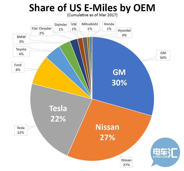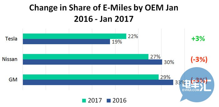 綜合報告數(shù)據(jù),通用汽車以及日產(chǎn)汽車從2012年起就開始保持了平穩(wěn)的增長速度。但伴隨著Model S和Model X的陸續(xù)推出,特斯拉僅在2016-2017年的不到兩年內(nèi),就躋身美國電動汽車?yán)鄯e行駛里程的前三甲,并迅速處于行業(yè)領(lǐng)先地位。從2016年1月份到2017年,特斯拉的電動行駛里程的份額上漲了3%,而日產(chǎn)以及通用汽車的份額均下降了3%。