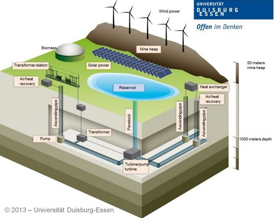 該項目利用26千米的礦井的一部分來儲存一百萬立方米的水,建設(shè)抽水蓄能,儲存附近多余的光和風(fēng)。由于目前抽水蓄能的選址越來越難,因此公布的抽水蓄能新項目很少。截止到2018年,德國將關(guān)閉許多煤礦,意味著將煤礦改造為抽水蓄能庫的項目將越來越多,且能夠做到經(jīng)濟可行。