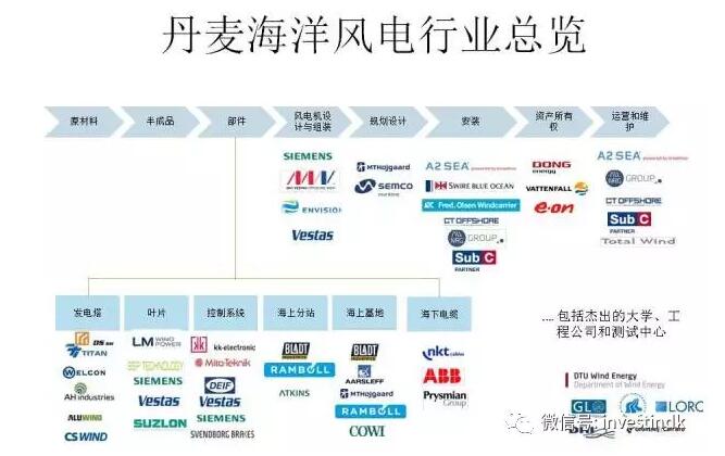 丹麥風電行業(yè)產(chǎn)業(yè)鏈完整,領跑的企業(yè)如Vestas,或者Dong Energy,而在每個風電的每個分支領域,都有細分的領先科技。也就是說,如果您因為技術或人才考慮丹麥風電,沒有一項是短板??聪孪聢D的整理。