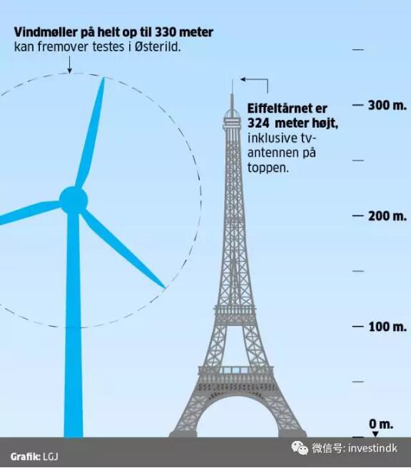 又比如,近日丹麥還通過了拓展風電渦輪測試中心的提案,用于支持測試比埃菲爾鐵塔還要高的超巨型風力渦輪機。風機總高達330米,蔚為壯觀。