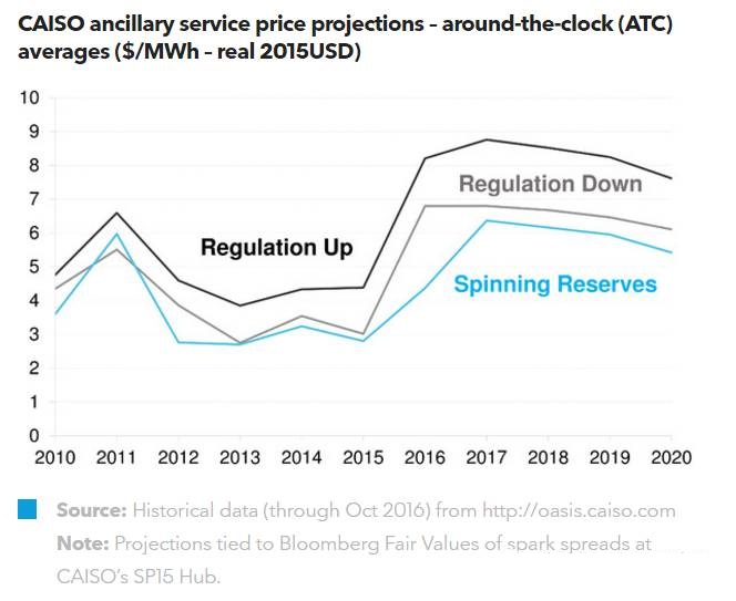 除了電力市場,CAISO電網覆蓋區(qū)域還有一個并行的日前電力輔助服務市場。這個輔助服務市場共包括四個不同主要產品,可在電網供需失衡時“消除”不平衡現象??偟膩碚f,2010到2015年間,輔助服務市場的規(guī)模為年均6000萬美元。到2016年第三季度,加利福尼亞州輔助服務市場的規(guī)模已經超過8000萬美元。