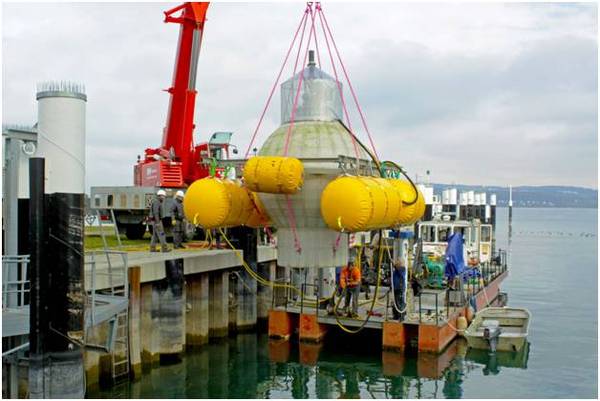 圖為上周從博登湖中取出,為期4周的探索性試驗所使用的直徑3米混凝土空心球