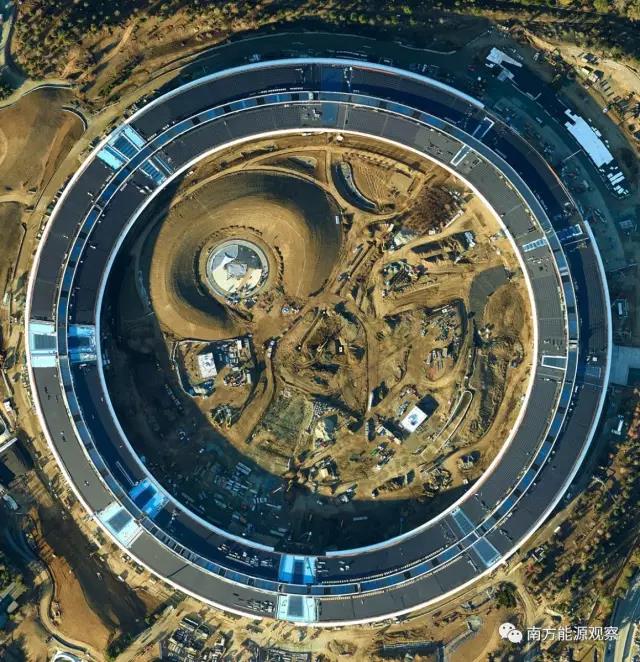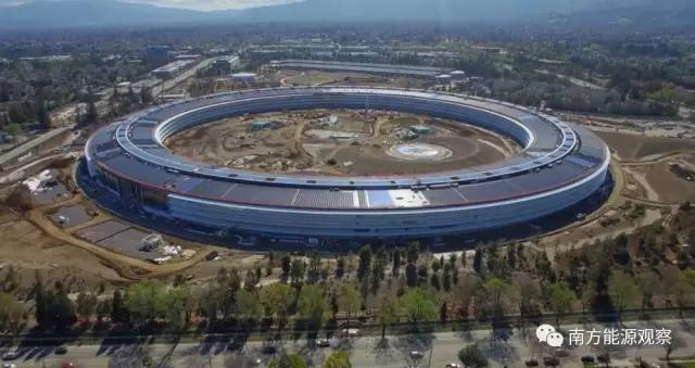 為了實(shí)現(xiàn)這一目的,Apple Park構(gòu)建了一個(gè)自給自足的微電網(wǎng)供應(yīng)系統(tǒng)。Apple Park主要的能源供給來(lái)自太陽(yáng)能,園區(qū)建筑物的屋頂被鋪滿了太陽(yáng)能光伏板,總裝機(jī)容量達(dá)到17MW,這也是世界上最大的屋頂光伏系統(tǒng)之一。
