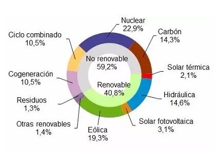 中國儲能網(wǎng)訊:根據(jù)西班牙電網(wǎng)公司REE公布的數(shù)據(jù),2016年西班牙發(fā)電量中有40.8%來自可再生能源(遠遠高于德國的29.5%),其中風(fēng)電占比高達19.3%,水電占14.6%,光伏占3.1%,光熱占2.1%。非可再生能源發(fā)電量占比59.2%,其中核電占22.9%,天然氣發(fā)電(含工業(yè)熱電聯(lián)產(chǎn))占21%,煤電占14.3%。