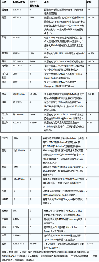 中國市場2016年表現(xiàn)搶眼,總的新增裝機(jī)量為10.2MW。包括12月26日并網(wǎng)發(fā)電的首航節(jié)能敦煌10MW熔鹽塔式電站,以及10月12日并網(wǎng)投運(yùn)的甘肅阿克塞800米熔鹽槽式示范回路,裝機(jī)200kW。這使得中國光熱發(fā)電的總建成裝機(jī)達(dá)到28.3MW。雖然中控德令哈10MW熔鹽塔電站于2016年8月20日并網(wǎng)發(fā)電,但因該項目是基于此前的10MW水工質(zhì)項目的改造工程,故這一新增裝機(jī)量不列入2016年的新增裝機(jī)統(tǒng)計。