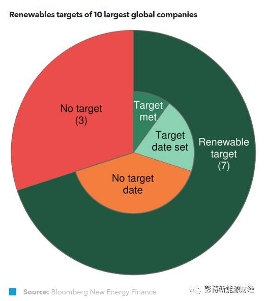目前,在世界十大企業(yè)中,有7家已經(jīng)制定了具體的可再生能源目標(biāo),也就是說(shuō)要在特定日期前,將公司使用的可再生能源電力在總用電量中的比例提升至一定水平。此外,長(zhǎng)期來(lái)看,這7家公司均有計(jì)劃將可再生能源電力的占比提升至100%。