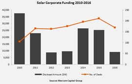 Mercom Capital集團(tuán)首席執(zhí)行官兼聯(lián)合創(chuàng)始人Raj Prabhu評(píng)論道:“對(duì)于太陽(yáng)能企業(yè)而言,今年是籌資充滿挑戰(zhàn)的一年,即使需求預(yù)期達(dá)到歷史新高。2017年可能比預(yù)期情況要好,因?yàn)榻M件價(jià)格降低預(yù)計(jì)將提升裝機(jī)量?!?