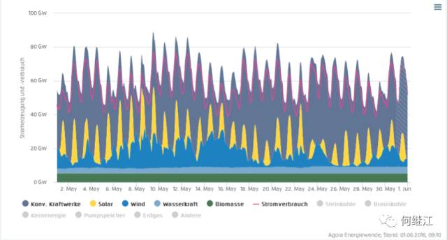 這天是個星期天,用電負(fù)荷低于工作日,風(fēng)電光伏都大發(fā),創(chuàng)造了記錄。這天的數(shù)據(jù)我此前做過一次計算,但錯誤地計算成了88%,特此向讀者們致歉。德國2016年1-5月可再生能源發(fā)電情況.最高時段88%。