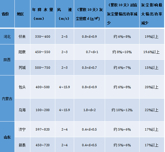 備注:0<d<0.7g/㎡時候,減少率從0迅速增加為7.4%;當1g/㎡<d時,減少率逐漸趨緩;d達到4g/㎡時,減少率增加到12.2%;當d>4g/㎡時,輸出功率減小率趨勢更緩。