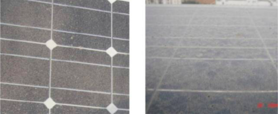 隨著光伏上網電價的大幅下降,沙塵和工業(yè)污染對于光伏電站收益率的影響不斷增大,在個別地區(qū)甚至已成為制約光伏電站建設開發(fā)的核心因素。表格1是“領跑者”基地灰塵對于光伏電站輸出電量的影響情況,可以看到,如果缺少必要防塵的措施,電站收益將“損失慘重”,特別是在內蒙古烏海地區(qū),由于當?shù)毓I(yè)污染嚴重,很容易產生類似“板結”的現(xiàn)象,專業(yè)解釋為“粘結積灰”(見下圖)。這類污染粘性和硬度很大,自然力量難以清除,需要較大的人為外力清除,這不僅影響電站發(fā)電量,還會增加電站運維成本。因此,越來越多的電站開發(fā)商開始選擇帶有SSG自清潔膜層的光伏組件,來保證電站收益率。
