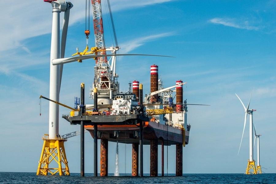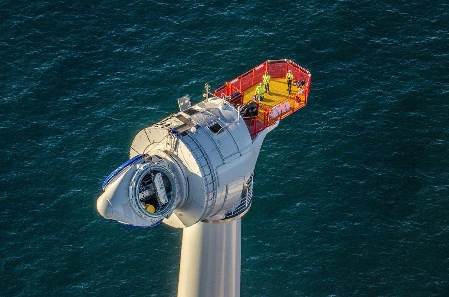 在距離海岸30英里的升降平臺(tái)上,承重800噸的黃色起重機(jī)會(huì)將機(jī)艙和葉片吊起到塔柱上。