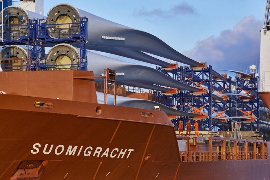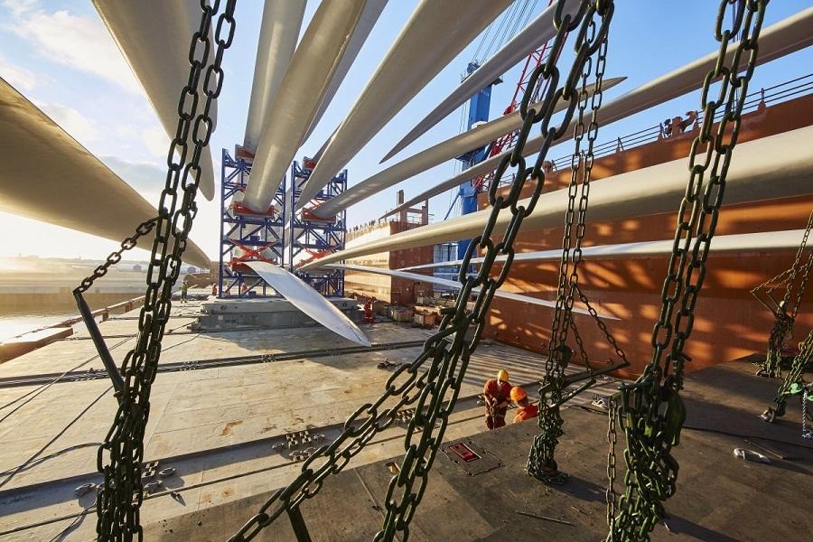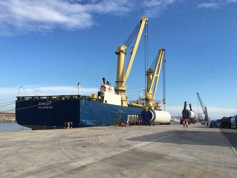 風(fēng)力渦輪機(jī)的白色塔柱是通過(guò)貨船從西班牙的阿維萊斯運(yùn)輸過(guò)來(lái)的。