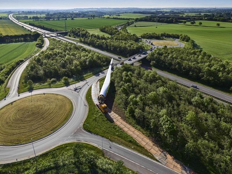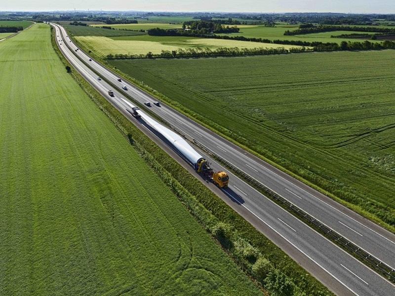 為了從丹麥運(yùn)輸渦輪機(jī)的葉片,項(xiàng)目團(tuán)隊(duì)使用了專用的拖掛車。照片中就是一輛行駛在高速路上的拖車。