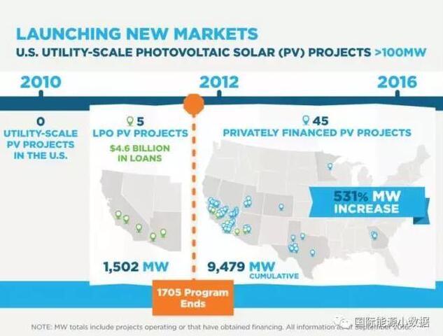 2012年以后“1705條款”到期,“貸款辦”不再為光伏項目提供擔保,但是市場上通過最先建設的5個大型光伏電站已經認識到了光伏的市場價值,對風險也有了掌控能力。因此,2012年至2016年9月底,私人商業(yè)資本共投資建設了45座大型光伏地面電站,總裝機容量9479兆瓦。至此,美國光伏市場日漸成熟,能源部“貸款辦”功不可沒。