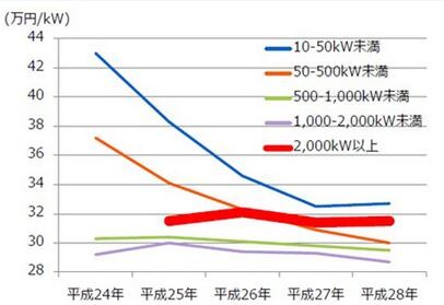 太陽能系統(tǒng)費(fèi)用年份推移(按規(guī)模統(tǒng)計(jì))(出處:經(jīng)濟(jì)產(chǎn)業(yè)省)