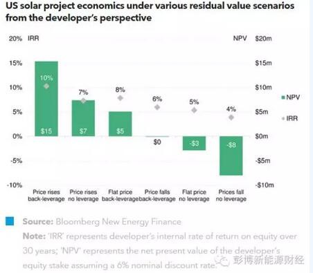 中國儲能網(wǎng)訊:在美國,越來越多的光伏項(xiàng)目是以短期承購合同的方式建設(shè)的,這樣就給合同到期后的殘余收入留下了更多的價值,而這些收入都是沒有事先約定價值的現(xiàn)金流。為了支持投資的合理性,許多美國的光伏設(shè)施開發(fā)商做出了過于樂觀、甚至可能犯了致命錯誤的假設(shè)——認(rèn)為債務(wù)成本仍將保持低位,而且太陽能電力的實(shí)際價格將會長期上升。