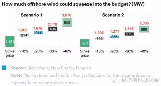 如果海上風(fēng)電能夠吞下整個(gè)預(yù)算,且投標(biāo)者均大膽出價(jià)(低于執(zhí)行價(jià)格40%),海上風(fēng)電技術(shù)有可能拿下3GW多一點(diǎn)容量(情景一)。但如果燃料發(fā)電技術(shù)拿到了最大份額,且沒有開發(fā)商的出價(jià)低于執(zhí)行價(jià)格,那大約僅有873MW的海上風(fēng)電容量有機(jī)會拿到預(yù)算(情景二)。