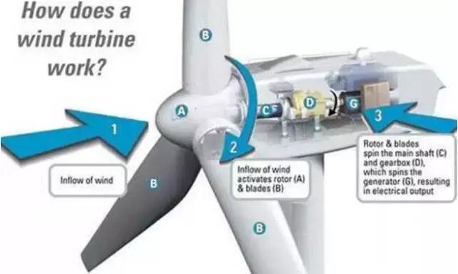 風電機組主要由風電機艙(內裝齒輪箱和發(fā)電機)、輪轂、葉片和塔筒等構件組成。風機的工作原理是空氣動力學原理。風并非"推"動風輪葉片,而是吹過葉片形成葉片正反面的壓差,這種壓差會產生升力,令風機旋轉并經(jīng)過齒輪箱進而帶動風力發(fā)電機轉子。由此,葉片和風機將風的動能(即空氣的動能)轉化成發(fā)電機轉子的動能,然后再將轉子的動能又轉化成電能輸出。