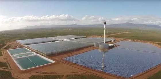 這個(gè)投資近2億美元的溫室,由23000太陽(yáng)能板、一個(gè)150米高的塔、附屬的海水淡化系統(tǒng)所組成。從2公里以外的海灣中抽取海水,太陽(yáng)能電板反射的太陽(yáng)光照射到塔的頂端,熱量將海水轉(zhuǎn)變?yōu)闊崃?、純水和電力。?jīng)淡化后的水就可以用于溫室中的西紅柿種植啦。