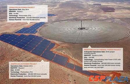 目前南非正在建設(shè)全球第一個(gè)混合了光伏和光熱發(fā)電的大型太陽能園區(qū),總裝機(jī)達(dá)到271MW。該園區(qū)由國際知名塔式熔鹽光熱發(fā)電項(xiàng)目開發(fā)商Solar Reserve和沙特ACWA電力公司共同開發(fā)的南非裝機(jī)為100MW的塔式熔鹽光熱電站Redstone和有Solar Reserve和其合作方已開發(fā)的75MW的Lesedi光伏電站和96MW的Jasper光伏電站組成,該項(xiàng)目集聚光太陽能與光伏太陽能于一體,以最低成本提供具備高產(chǎn)能系數(shù)的基礎(chǔ)負(fù)荷可再生能源,可完全取代燃煤發(fā)電。