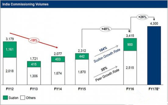 2015年4月29日,蘇司蘭出售其在德國風(fēng)機(jī)市場(chǎng)股份,到9月底,風(fēng)機(jī)訂單量急速上漲到1136MW,價(jià)值716.5億印度盧比。2015財(cái)年,蘇司蘭在印度風(fēng)機(jī)市場(chǎng)發(fā)展良好,裝機(jī)容量達(dá)到3400MW,預(yù)計(jì)到2017年可增長(zhǎng)30%。