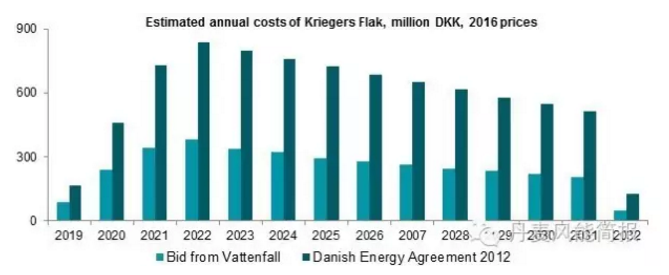 注:淺藍(lán)色為Vattenfall的競(jìng)標(biāo)價(jià)格,深藍(lán)色為2012年丹麥能源協(xié)議的估算電價(jià)
