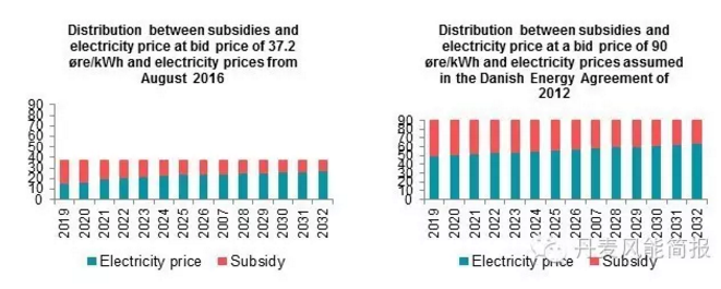 左圖為2016年11月Vattenfall中標(biāo)電價(jià)和政府補(bǔ)貼,按2016年8月電力市場(chǎng)平均上網(wǎng)價(jià)格。右圖為2012年丹麥能源協(xié)議計(jì)劃中預(yù)估該項(xiàng)目的電價(jià)水平和政府補(bǔ)貼。藍(lán)色為電力市場(chǎng)上網(wǎng)電價(jià),紅色為政府補(bǔ)貼(即公共服務(wù)基金PSO)。