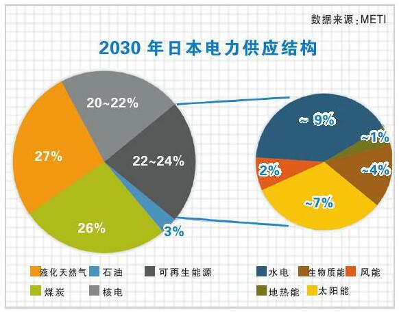 2014年,日本內閣政府審核通過一項新修訂的《能源基本計劃》。該計劃再次對核電和燃煤發(fā)電在日本能源結構中的作用進行評估和定位,認為兩者都是“重要的基本負荷電源”,并且認為可再生能源將在一個很長的時間范圍內逐步地取代其他能源。這個計劃同時也在日本公布的《能源長期供應與需求展望2015》報告中體現。報告中,日本政府計劃,到2030年增加電力需求(與2013年相比),并且公布了一組到2030年的發(fā)電占比組成比例:液體天然氣占27%、煤炭占26%、石油占23%、核電占21%,其他可再生能源占3%。