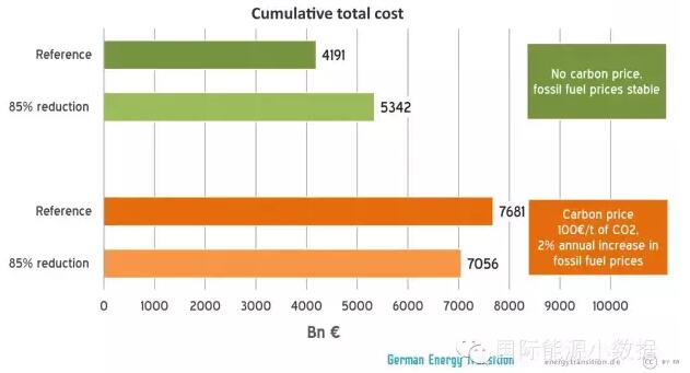 但是,上述的比較有個假設:化石能源價格到2050年保持穩(wěn)定(不再增長),而且不考慮碳價。如果假設化石能源價格每年上漲2%,碳價達到每噸100歐元,那么不轉型的成本就會更高。