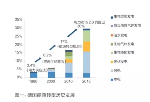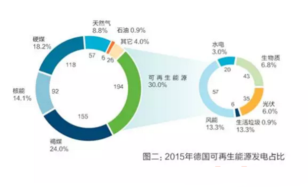 德國能源轉(zhuǎn)型成效卓著,2015年德國年發(fā)電總量達648太瓦時,可再生能源發(fā)電194太瓦時,占發(fā)電總比重的30%。其中尤以風(fēng)光發(fā)電為主,分別占比13.3%與6%。