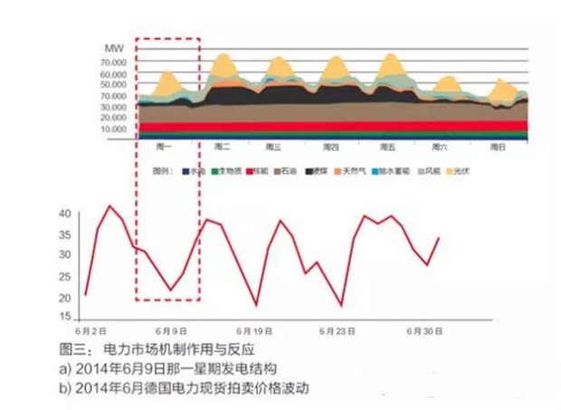 兩個案例有力證明了德國電力市場的有效性。第一個案例是2014年6月9日中午,光伏發(fā)電功率占比超過50%(圖三a)。那是一個公共假日,需求負荷低,光照良好,當(dāng)天中午的光伏發(fā)電占比創(chuàng)了記錄。當(dāng)日電力出口達到高峰,現(xiàn)貨拍賣價格也有所下降(圖三b),基于9日的情況,遠期市場價格也有所下降。