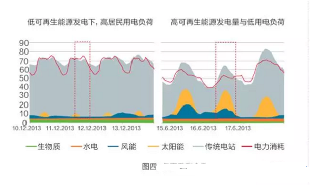 由于政策已制訂了未來可再生能源發(fā)電高比例增長的目標(biāo),而目前市場上低邊際成本的風(fēng)電光伏又能優(yōu)先并網(wǎng)發(fā)電,剩余需求負荷(residualload)于是成為影響電力市場設(shè)計的一個重要概念。它指除去風(fēng)光發(fā)電外、剩余發(fā)電組合所需承擔(dān)的電力需求量。圖四分別給出了冬夏季可再生能源發(fā)電量與剩余需求負荷間的普遍關(guān)系,夏季風(fēng)光發(fā)電多,需求總量較小,剩余需求負荷小;冬季反之。未來還可能出現(xiàn)兩種極端情況:1.最大剩余需求負荷:用電需求高,同時幾乎不產(chǎn)生風(fēng)能和太陽能,這可能發(fā)生在一個寒冷無風(fēng)的冬夜;2.最小剩余需求負荷:電力需求低,但同時產(chǎn)生大量風(fēng)能和太陽能發(fā)電,這可能發(fā)生在有風(fēng)和/或陽光明媚的周末或節(jié)假日。