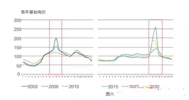 在傳統(tǒng)能源結(jié)構(gòu)下,用電高峰使峰值電價總是出現(xiàn)在每日10:00到14:00點之間,可達日平均電價的1.2至2倍。隨著越來越多風(fēng)能與太陽能的投入,傳統(tǒng)化石能源逐漸退出發(fā)電市場,電價波動更為頻繁劇烈。模擬結(jié)果顯示,午間時段10:00到14:00間的用電高峰恰也是未來太陽能發(fā)電高峰,隨著光伏的規(guī)模不斷擴大,中午的電力供需矛盾將明顯緩解,這一時段的峰值電價曲線趨于平緩。傍晚時分太陽能發(fā)電大幅減弱直至為零,此時生活用能趨高,而傳統(tǒng)化石能源發(fā)電規(guī)模已經(jīng)削減,傍晚將出現(xiàn)全天的峰值電價。日內(nèi)電價峰值將由過去的雙峰變?yōu)槲磥淼膯畏?。?030年日峰值電價最多可達平均電價的2.5倍以上,同時夜間01:00到06:00點的谷期電價也有抬升:2002和2006年的最低谷期電價僅為日平均電價的二分之一,而從2015年起這一數(shù)字將提高到0.7左右。這樣的價格信息反映了綠色能源結(jié)構(gòu)對未來電力市場的影響。縱向相比圖右2023年傍晚的峰谷價與日平均電價相比分別為2.6與0.7,大約是4倍。而到2030年,峰谷價差明顯縮小,這恰是2.0市場、需求側(cè)管理、儲能等多項因素發(fā)揮作用的結(jié)果。