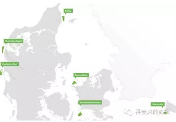 丹麥近海風(fēng)電項(xiàng)目共五個(gè)場(chǎng)址,共350MW,分別位于Vesterhav Nord, Vesterhav Syd, S?by, Sm?landsfarvandet, 和 Bornholm(原規(guī)劃如圖有六個(gè),今年4月份中部的場(chǎng)址Serejo Bugt已經(jīng)出局)。