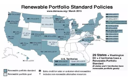 在美國(guó),可再生能源配額由各個(gè)州自己立法確定,一般由各個(gè)州的公共事業(yè)委員會(huì)進(jìn)行監(jiān)管,各州定的標(biāo)準(zhǔn)存在很大的差異,至今共有近30個(gè)州頒布法律保障實(shí)施。如圖: