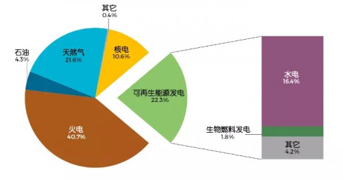可再生能源目前已成為全球電力生產(chǎn)第二大來源,在2014年占世界生產(chǎn)總量的22.3%,僅次于煤炭(40.7%),領(lǐng)先于天然氣(21.6%)、核能(10.6%)和石油(4.3%)。