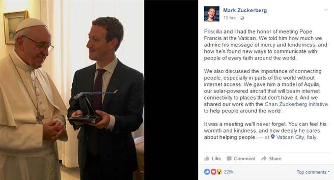 根據(jù)《紐約郵報》(New York Post)報導(dǎo),祖克伯在臉書上表示他和妻子非常讚賞教宗散播慈悲為懷精神的作為,也相當(dāng)讚賞教宗如何找到各種新方法,來和全世界各種信仰的人們溝通。