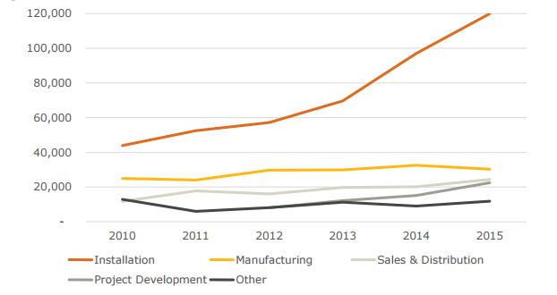 根據(jù)美國(guó)勞工部數(shù)據(jù),美國(guó)太陽(yáng)能行業(yè)在2015年所創(chuàng)造的就業(yè)崗位超過(guò)美國(guó)油氣勘探和管道工業(yè)的總和,其增速更是美國(guó)經(jīng)濟(jì)增速的12倍。