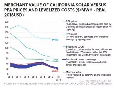 由于加利福尼亞州的太陽(yáng)能發(fā)電項(xiàng)目已經(jīng)通過(guò)長(zhǎng)期購(gòu)電協(xié)議保障了自己的利潤(rùn)。因此,對(duì)這部分現(xiàn)有項(xiàng)目而言,這些因素都并不重要。當(dāng)?shù)氐拇蠖鄶?shù)光伏容量所有者暫時(shí)無(wú)需面對(duì)批發(fā)電力市場(chǎng)的競(jìng)爭(zhēng),至少在合同到期之前是這樣。不過(guò),當(dāng)合同到期后,這部分光伏容量將不得不直面低得可怕的商業(yè)利潤(rùn),(我們認(rèn)為)這部分利潤(rùn)可能無(wú)法完全體現(xiàn)在對(duì)項(xiàng)目“剩余價(jià)值”的估計(jì)之中。2015年,加州光伏發(fā)電資產(chǎn)所有者拿到的加權(quán)平均購(gòu)電協(xié)議價(jià)格為$136/MWh(由電廠支付),而新合同中規(guī)定的電價(jià)僅為$66/MWh。不過(guò),這兩個(gè)價(jià)格均仍遠(yuǎn)高于批發(fā)電價(jià)。