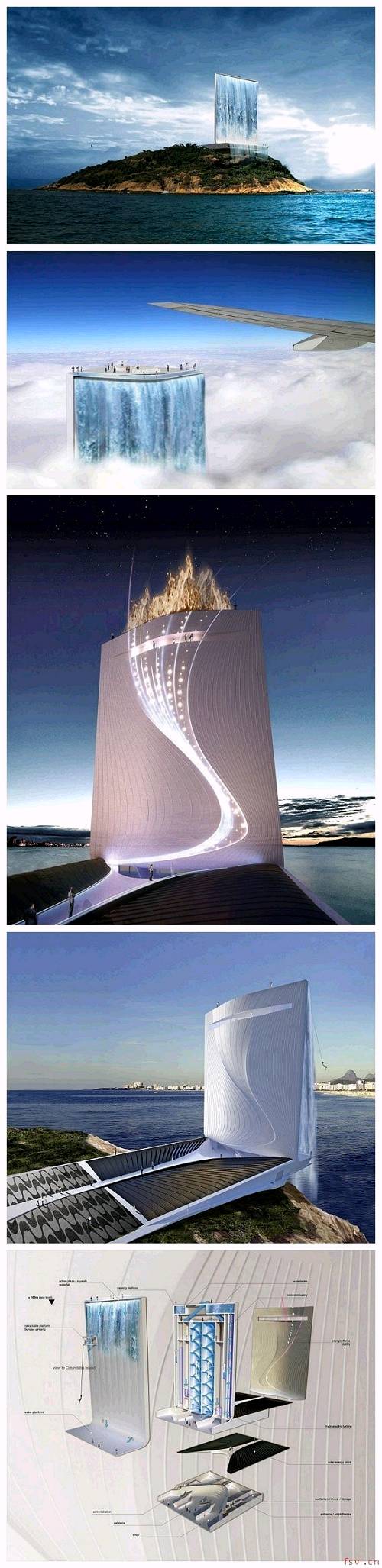 這座象征巴西奧運新地標(biāo)太陽能瀑布塔(SolarCityTower)的概念是來自于環(huán)保與自然,并融入巴西世界第一大瀑布伊瓜蘇大瀑布的想象。這種建筑白天能藉由太陽能板吸收太陽光并發(fā)電,同時儲存電力,提供晚上使用。