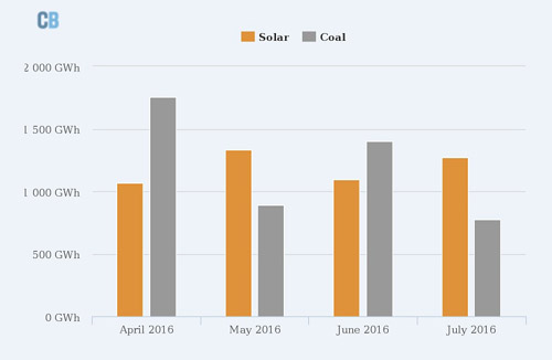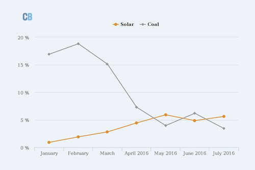該媒體的報(bào)道稱,日光伏發(fā)電量首次超過煤炭火力是在2016年4月9日。同樣,周光伏發(fā)電量超過煤炭火力是5月3日那周。