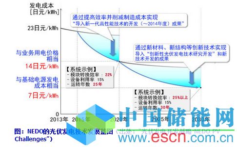 對(duì)新一代光伏發(fā)電領(lǐng)域的技術(shù)影響,戰(zhàn)略中寫明了“轉(zhuǎn)換效率要提高至目前普及的光伏發(fā)電的2倍、;通過降低制造和設(shè)置成本并大幅提高發(fā)電效率,實(shí)現(xiàn)與基礎(chǔ)電源相當(dāng)?shù)陌l(fā)電成本(7日元/kWh)。這些影響預(yù)測(cè)與NEDO(新能源產(chǎn)業(yè)技術(shù)綜合開發(fā)機(jī)構(gòu))2014年9月發(fā)布的“光伏發(fā)電開發(fā)戰(zhàn)略(NEDOPVChallenges)”是相協(xié)調(diào)的(圖)。
