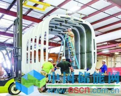 中國儲能網(wǎng)訊:近日,美國能源部橡樹嶺國家實驗室利用3D打印技術,打造了一輛汽車和一間房屋,這輛汽車使用的電池能夠與房屋匹配。房屋是通過屋頂?shù)奶柲馨鍨樽陨硖峁┠茉矗嘤嗟奶柲軐粌Υ嬖陔姵刂?;汽車??吭诜课萃庖粋€無線襯墊上,這個無線襯墊能夠使汽車和房屋之間的能源雙向傳送。在高峰用電時刻,汽車將幫助房屋供電;在汽車需要使用時,房屋的太陽能板又幫助汽車電池充電。圖為當?shù)毓と苏诮M裝房屋。