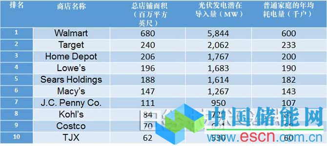 圖2:美國(guó)排名前十的倉(cāng)儲(chǔ)式商店與設(shè)置光伏發(fā)電系統(tǒng)的潛力(出處:美國(guó)環(huán)境研究與政策中心的《在超級(jí)商店安裝光伏發(fā)電系統(tǒng)》)
