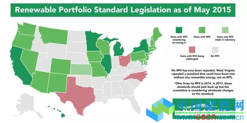 美國是第一個(gè)實(shí)行可再生能源配額制的國家,也是實(shí)行可再生能源配額制較為成功的一個(gè)國家。截至2015年5月,已有30多個(gè)州依據(jù)本州資源、市場(chǎng)、政策背景制定并實(shí)施了可再生能源配額制,實(shí)施RPS的州和地區(qū)分布如下圖。據(jù)憂思科學(xué)家聯(lián)盟預(yù)測(cè),到2025年,可再生能源配額制將促使美國的可再生能源電力增加76750MW,配額制對(duì)可再生能源發(fā)展的促進(jìn)功能由此可見一斑。