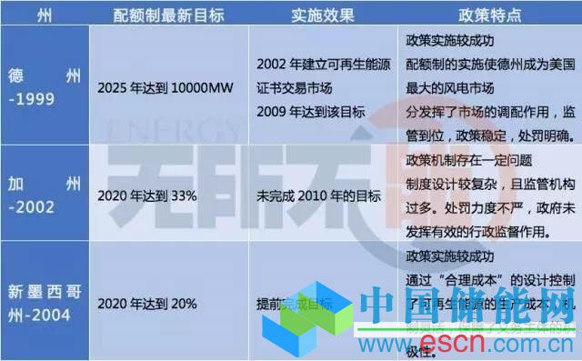 其中,德克薩斯州、加利福尼亞州和新墨西哥州為美國實(shí)施可再生能源配額制比較典型的幾個(gè)地區(qū),其實(shí)施效果對(duì)比如下。