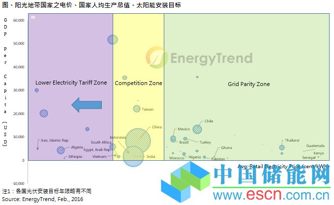 目前太陽帶地區(qū)里約有48%的國家進(jìn)入市電同價(jià)區(qū)、33%的國家進(jìn)入電價(jià)競爭區(qū)、19%的國家之太陽能發(fā)電電價(jià)則仍高于市電。部分人均生產(chǎn)總值低于US$10,000以下的國家,其經(jīng)濟(jì)發(fā)展成長促使電力需求提高,以公共事業(yè)級太陽能電站取代部分傳統(tǒng)電力的需求更為明顯,因此對太陽能安裝目標(biāo)設(shè)定較高。