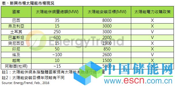 市電同價(jià)區(qū)域及競爭區(qū)域中,2015年已有少數(shù)國家安裝量顯著成長,包括印度、泰國、菲律賓及智利等國。林建翰表示,雖然市電同價(jià)區(qū)仍有少數(shù)國家因經(jīng)濟(jì)狀況不佳或是當(dāng)?shù)刭Y源有限,而無太陽能電力收購政策,但系統(tǒng)造價(jià)的續(xù)跌將提高安裝動(dòng)力,加上由印度與法國領(lǐng)軍的國際太陽能聯(lián)盟即將推動(dòng)對熱帶國家的1兆美元投資案,預(yù)計(jì)接下來5年左右能成為下一批成熟的市場。包括:墨西哥、巴西、尼日利亞、土耳其、突尼斯、巴基斯坦、印尼、越南、阿聯(lián)酋等。