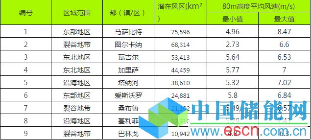 此項(xiàng)調(diào)研的評(píng)估結(jié)果填補(bǔ)了肯尼亞風(fēng)能資源圖譜中80m 高度風(fēng)速變化這一空缺。研究發(fā)現(xiàn),在東部的馬薩比特地區(qū)有75596km2 的潛在風(fēng)區(qū),年平均風(fēng)速最高達(dá)到8.47m/s 、最低風(fēng)速達(dá)到4.96m/s 。表1 重點(diǎn)介紹了一些潛在風(fēng)區(qū)所在的省份及區(qū)域,以及這些地區(qū)的年平均風(fēng)速最高值和最低值。