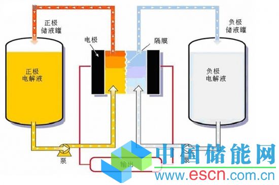 人們不斷尋找正極和負(fù)極材料,提升能量密度,干電池、鎳鎘電池還是鋰電池,無論材料怎么升級,傳統(tǒng)電池對活性物質(zhì)的利用率很低,能夠產(chǎn)生電能的物質(zhì)被包裹在必須的非活性物質(zhì)之中。在常見的鋰電池里面,鋰材料只含電池重量的2%左右,這些非活性物質(zhì)增加了電池成本,降低了活性物質(zhì)的利用率。因?yàn)閭鹘y(tǒng)電池的這些弱點(diǎn),誕生了液流電池。液流電池可以視為一個(gè)獨(dú)立的大電池,正負(fù)極電解液分別存放,集中反應(yīng)產(chǎn)生電能。這樣無需昂貴的附加材料,可以大大提升效率。